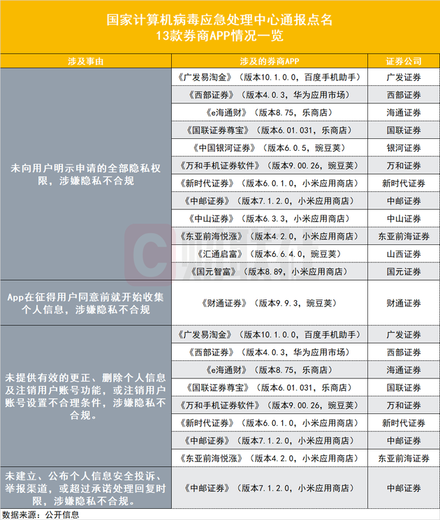 此次被点名主要为证券投资、智能投顾等炒股类软件,13款被点名的证券APP包括:广发易淘金APP、西部证券APP、海通证券e海通财APP、国联证券尊宝APP、中国银河证券APP、万和手机证券APP、新时代证券APP、中邮证券APP、中山证券APP、东亚前海悦涨APP、国元智富APP、山西证券汇通启富APP、财通证券APP。除此之外大智慧等知名炒股软件也在列。 上述APP涉嫌隐私不合规违规的四项具体原因分别是: 未向用户明示申请的全部隐私权限; APP在征得用户同意前就开始收集个人信息; 未提供有效的更正、删除个人信息及注销用户账号功能,或注销用户账号设置不合理条件; 未建立、公布个人信息安全投诉、举报渠道,或超过承诺处理回复时限等。 其中,未向用户明示申请的全部隐私权限是违规重灾区,涉及16款APP。 记者了解到,本次病毒中心发布的通报结果并非全行业的评测,主要是抽查的形式。根据多家被点名券商综合反馈,其背后原因也与不同测评机构的标准不一致,导致测评报告存在较大差异有关。但合规无小事,尽管被点名的券商APP只是少数,但该事件已在业内引发重视,有券商网金部门表示已第一时间展开自查。 13款券商APP隐私不合规被点名 国家计算机病毒应急处理中心互联网监测最新通报显示,近期,通过互联网监测发现17款移动APP存在隐私不合规行为,违反网络安全法、个人信息保护法等相关规定,涉嫌超范围采集个人隐私信息。记者注意到,这其中超过七成为券商APP,13款被点名的APP名单如下: