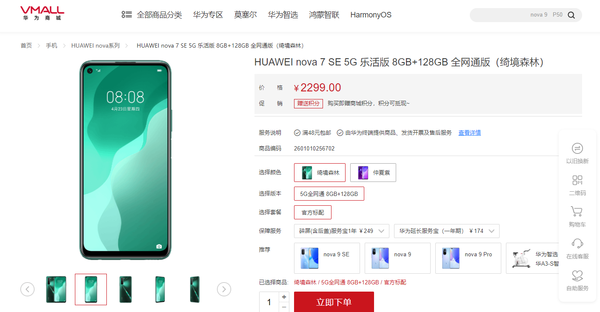 价格方面,目前华为nova 7 5G提供8GB+128GB一种版本,售价2999元,华为nova 7 SE 5G也只有8GB+128GB可选,售价为2299元。 |