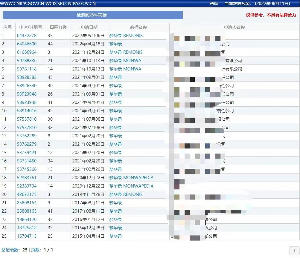 颜值剧情双在线引热潮 早在《梦华录》开播前,该剧就因主演的颜值备受期待。“神仙姐姐”刘亦菲重回影视剧荧幕,刷爆了观众的预期值,其与陈晓组成的“顾盼生辉”CP也让粉丝津津乐道。6月6日,人民网点评《梦华录》,称刘亦菲的表演很好地诠释了珍视自己、自强不息的女性角色。 随着剧集的升温,相关商标注册也引人关注。 中国证券报记者通过查询中国商标网发现,截至6月11日,“顾盼生辉”商标共计有9件,指定使用在第3类,第5类,第14类等多个商品及服务类别,均处于核准注册且有效的状态。“梦华录”相关商标共计被申请过25次,其中,最近的3项处于待审查状态。 值得注意的是,《梦华录》官方公布的开机拍摄日期为2021年2月16日至2021年7月5日,自2021年2月20日起,便有厦门某网络科技有限公司将“梦华录”商标提交了注册申请,国际分类涉及颜料油漆、手工器械、运输工具等共计5个大类。如今,这些商标的状态均为“申请被驳回、不予受理” “该商标已失效”等。此外,还有四川、河南、上海等多家公司分别在《梦华录》开机后,申请注册过多件“梦华录”相关商标。 其中,一家四川的企业直接以“梦华录”作为公司名称。天眼查官网显示,该公司成立于 2021年7月15日,注册资本为50万人民币。该公司在《梦华录》杀青后的9月提交了5件“梦华录”商标的注册申请。截至目前,这些商标除了第41类(教育娱乐)的“待审查”之外,其他几个类别的商标状态都显示“注册”。