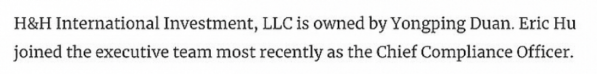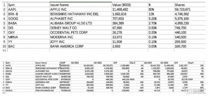 来源:格隆汇 2月15日傍晚,有网友在投资社区雪球发布分析指出,被称为“中国巴菲特”的投资大师段永平“增持阿里,清仓拼多多”。 该雪球用户发帖《减持苹果,增持阿里,清仓拼多多。段永平最新13F持仓》,并上传截图显示,根据H&H International Investment, LLC提交的最新13F文件,在2023年第四季度末,该机构总共持有九家公司,“总市值144.5亿美元,前四大持仓为114.98亿美元苹果、16.92亿美元伯克希尔哈撒韦、7.57亿美元谷歌、3.84亿美元的阿里巴巴。”同时,这位雪球用户还指出,相比上一季度,H&H International Investment, LLC“新买入西方石油,增持阿里巴巴、摩德纳、美国银行,减持了苹果、伯克希尔、迪士尼和欢聚时代,清仓了拼多多。” “搜索该机构的名称,可以确定H&H International Investment, LLC是段永平先生控制的投资公司。”该消息源补充道,“H&H International Investment, LLC显然不是段永平控制的唯一投资账户,但可能是唯一可以通过公开渠道查询到记录的账户。” (图为雪球用户晒出“段永平最新13F持仓”截图,以及外文网站对H&H International Investment, LLC是段永平持有机构的介绍。) |