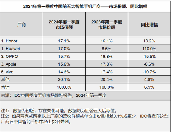 4月25日,国际数据公司(IDC)发布的最新手机季度跟踪报告显示,2024年第一季度,中国智能手机市场出货量约6926万台,同比增长6.5%。与全球市场情况类似,市场需求的持续恢复帮助中国智能手机市场延续去年底的反弹势头,且市场表现高于预期。得益于Honor和Huawei等厂商的良好市场表现,推动了整体Android市场同比增长9.3%。 报告显示,一季度荣耀、华为并列中国智能手机市场第一。Apple出货量同比下降6.6%,并列国内市场第三位,丢掉第一“宝座”。虽然不断进行调价促销,且iPhone 15 Pro Max在春节期间为最畅销的机型,但是苹果面临竞品的挑战和压力日益增大,亟需从软硬件全方位升级创新来吸引消费者。