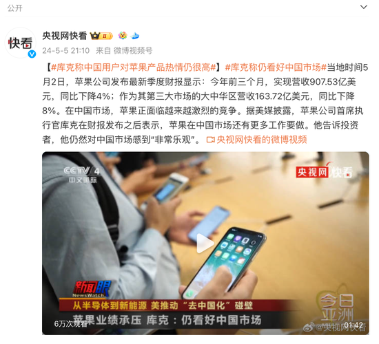 炒股就看金麒麟分析师研报,权威,专业,及时,全面,助您挖掘潜力主题机会! 原标题:《太意外!知名品牌大中华区销量大跌,营收下滑8%!“中国用户热情仍很高!”CEO最新发声:中国之行很棒很享受》 北京时间5月3日,苹果公司发布最新季度财报显示:今年前三个月,实现营收907.53亿美元,同比下降4%;作为其第三大市场的大中华区营收163.72亿美元,同比下降8%。 据@央视网快看5月5日报道,苹果公司CEO(首席执行官)库克称中国用户对苹果产品热情仍然很高。在中国市场,苹果正面临越来越激烈的竞争。据美媒披露,库克在财报发布之后表示,苹果在中国市场还有更多工作要做。他告诉投资者,他仍然对中国市场感到“非常乐观”。