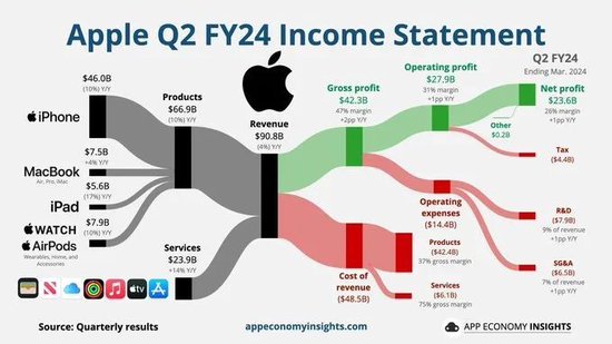 iPhone在华销量下降19% 库克称中国是全球竞争最激烈的市场 综合界面新闻、财联社报道,北京时间5月3日,苹果公司发布2024年第二财季(2024年1月至3月)营收报告。报告显示,苹果当季营收907.5亿美元,同比下滑4%;净利润236.36亿美元,同比下滑2%。 分业务来看,苹果公司目前最赚钱的产品仍然是iPhone,iPhone营收为459.6亿美元,同比下滑10%,但高于预期的458亿美元,仍然占据苹果营收的半壁江山;iPad营收下滑16.7%至55.6亿美元;可穿戴设备、家居及配件收入79.1亿美元,同比同样下滑;Mac营收74.5亿元,超出67.9亿美元的预期。 包括Apple Music、TV+流媒体平台、iCloud订阅和App Store业务在内的服务收入在第二财季同比增长14.2%至238.7亿美元,连续五个季度创下新高。这也是苹果当下利润率最高的业务,在其总营收中占比两成。