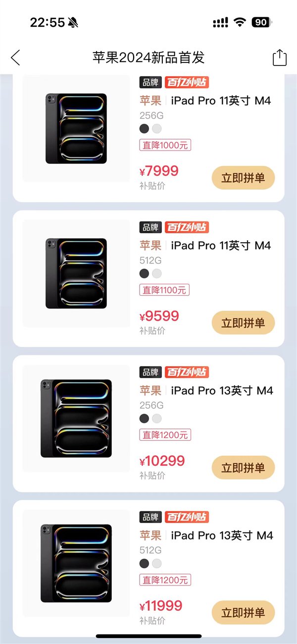 快科技5月9日消息,苹果刚刚发布了全新的iPad Pro,虽然性能极强,但8999元的价格依然遭到的无数网友吐槽。 不过,拼多多百亿补贴已经出手,目前已将上线新款iPad Pro系列,全系降价至少1000元。